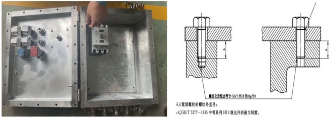 GB3836.2-2010第11.5条对于隔爆外壳及其紧固件与相关的孔有明确要求:“紧固件不应穿透隔爆外壳壁,除非它们与壳壁构成隔爆接合面并且与外壳不可分开,例如使用焊接、铆牢或其他等效方法”。隔爆外壳及其紧固件与相关的孔装配型式,主要分为两种: