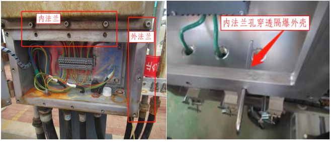 2. 内法兰型式隔爆外壳:设备壳盖法兰与壳体内侧法兰形成平面接合面防止腔体内侧与外侧贯通,该平面接合面构成隔爆设备的外壳壁,因此该接合面装配紧固件需满足GB3836.2-2010第11.5,11.6,11.7条:紧固件不应穿透隔爆外壳壁;对于不穿透隔爆外壳壁的螺孔或双头螺栓孔,隔爆外壳壁的剩余厚度应至少是螺栓或双头螺栓直径的三分之一,最小为3mm;当螺栓不带垫圈被完全拧入到隔爆外壳壁的盲孔中时,在孔的底部因至少保留一整扣螺纹的余量。如下图所示设备中壳体内侧法兰(平面接合面)紧固件孔穿透设备壳体,不符合标准要求 。